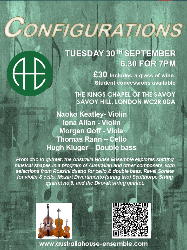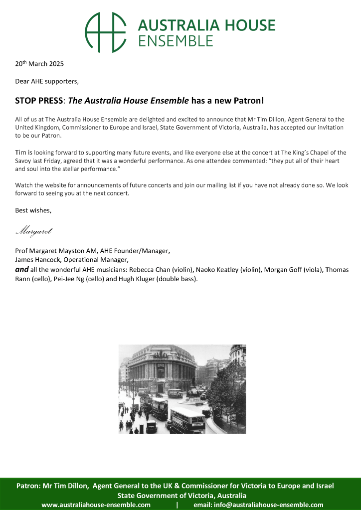The ensemble aspires to be a world-class ensemble featuring the finest Australian musicians in London, UK and worldwide, named the “Australia House Ensemble. This ensemble will be a flagship for Australian musical excellence of which it is hoped Australia will be proud.